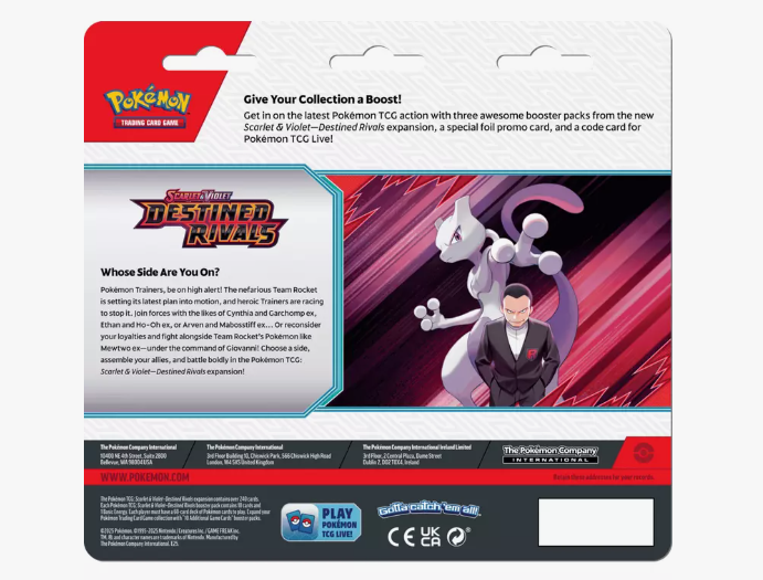 Whose Side Are You On? Pokémon Trainers, be on high alert! The nefarious Team Rocket is setting its latest plan into motion, and heroic Trainers are racing to stop it. Join forces with the likes of Cynthia and Garchomp ex, Ethan and Ho-Oh ex, or Arven and Mabosstiff ex… Or reconsider your loyalties and fight alongside Team Rocket’s Pokémon like Mewtwo ex—under the command of Giovanni! Choose a side, assemble your allies, and battle boldly in the Pokémon TCG: Scarlet & Violet—Destined Rivals expansion!