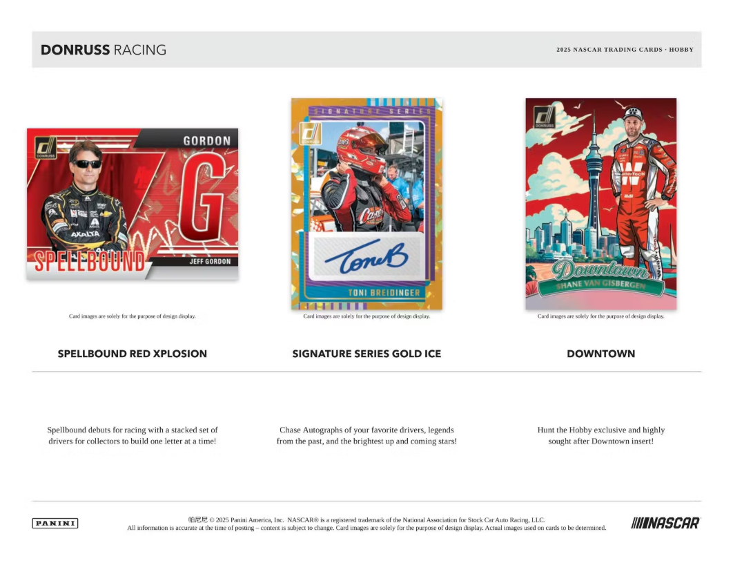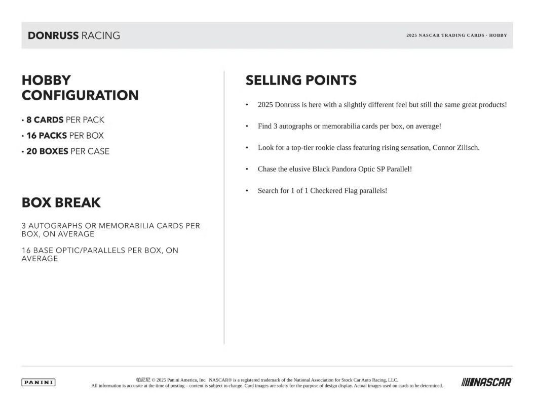 BASE: Donruss Racing is back for 2025 with a new feel! Find a 100-card base set with 93 base and 7 Rated Rookies!